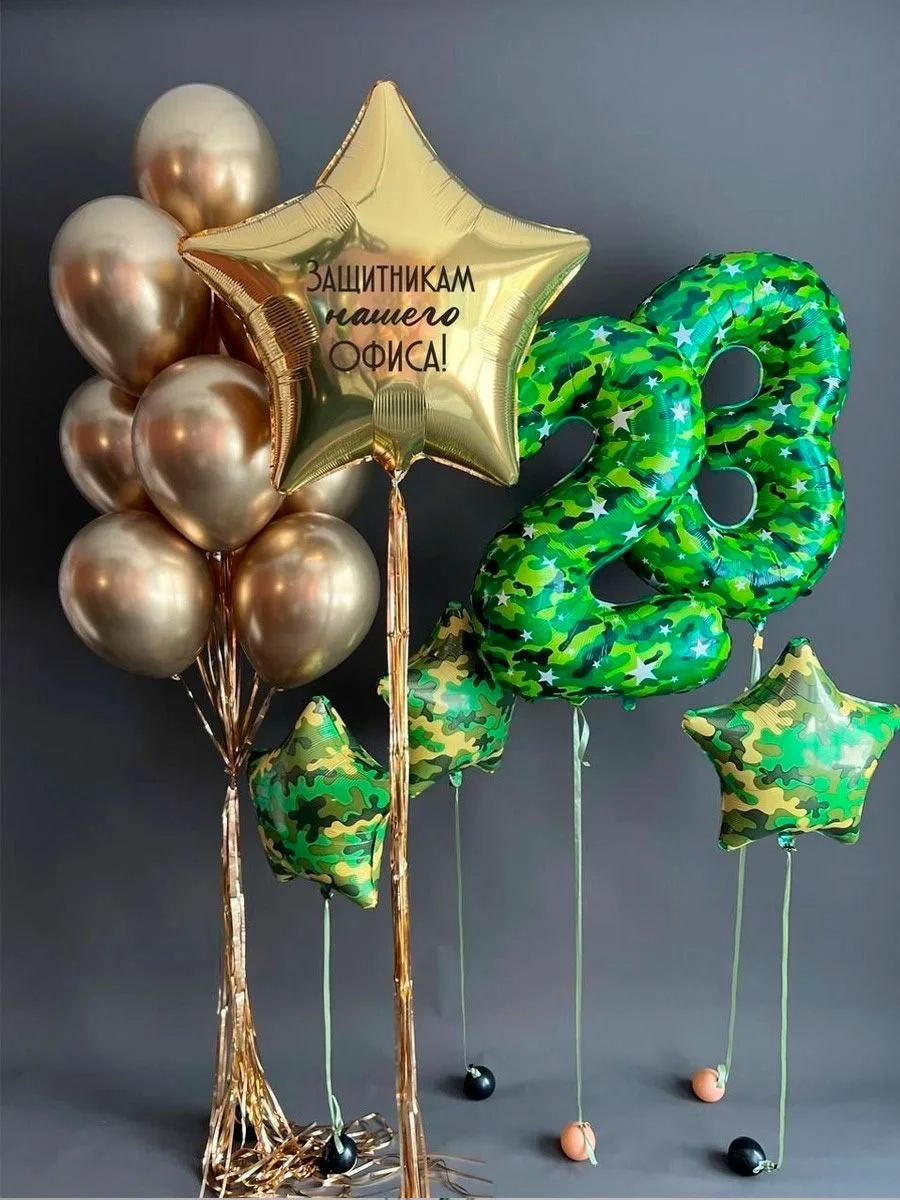 Большая звезда, цифра 23, фонтан из шаров и звёзды камуфляж