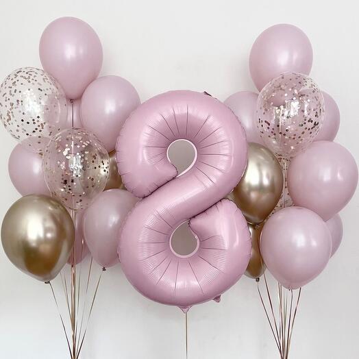 Розовая цифра восемь и фонтаны из шаров