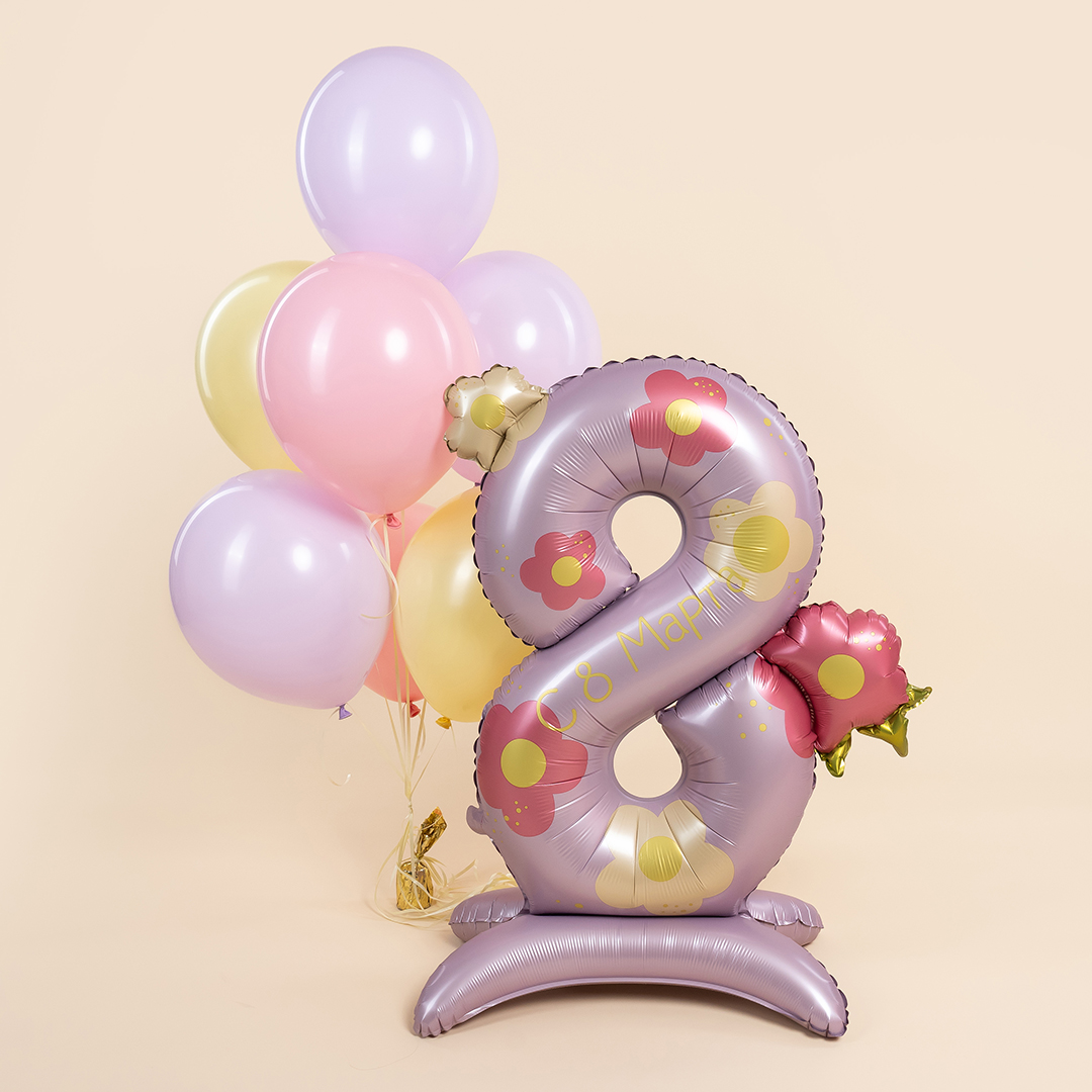 Цифра восемь с рисунком и нежный фонтан из шаров