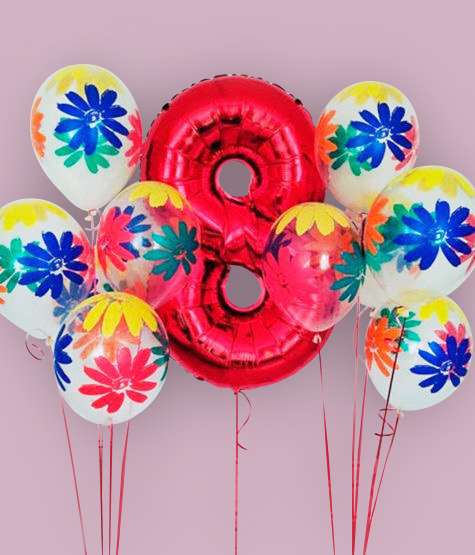 Красная цифра восемь и фонтаны из шаров с рисунком цветов
