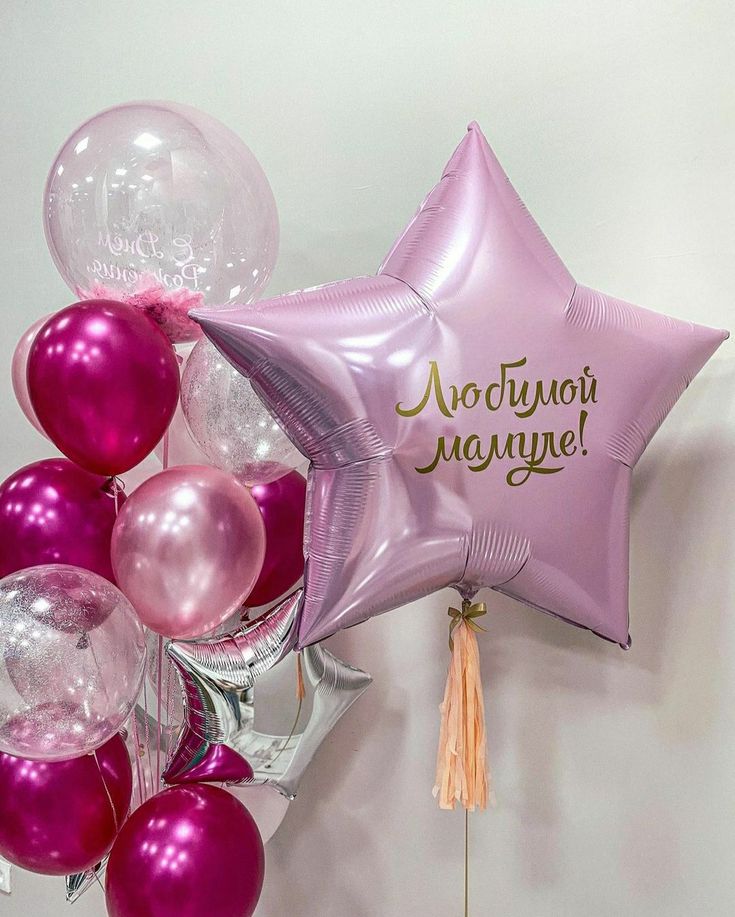 —Нежно розовая звезда с надписью и фонтан из шаров