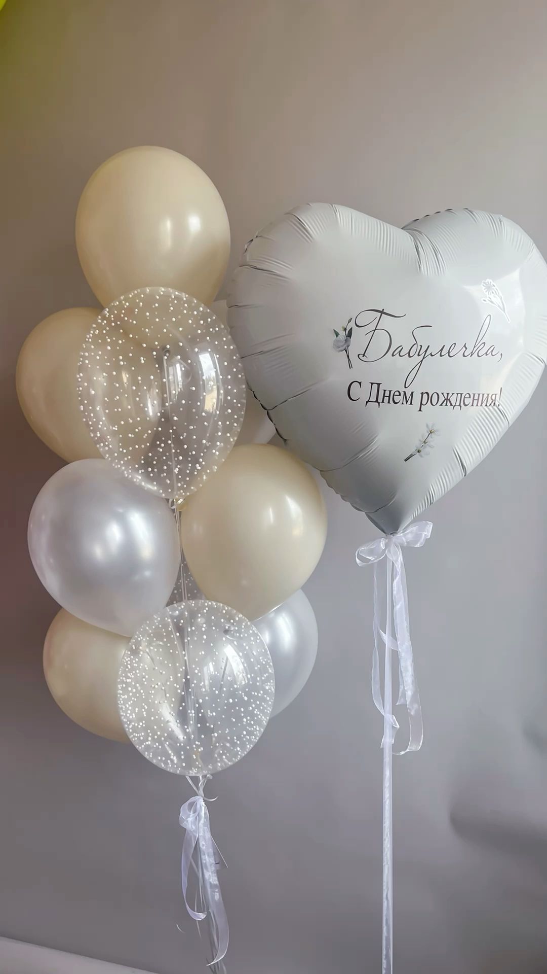 —Белое сердце с надписью и фонтан из шаров