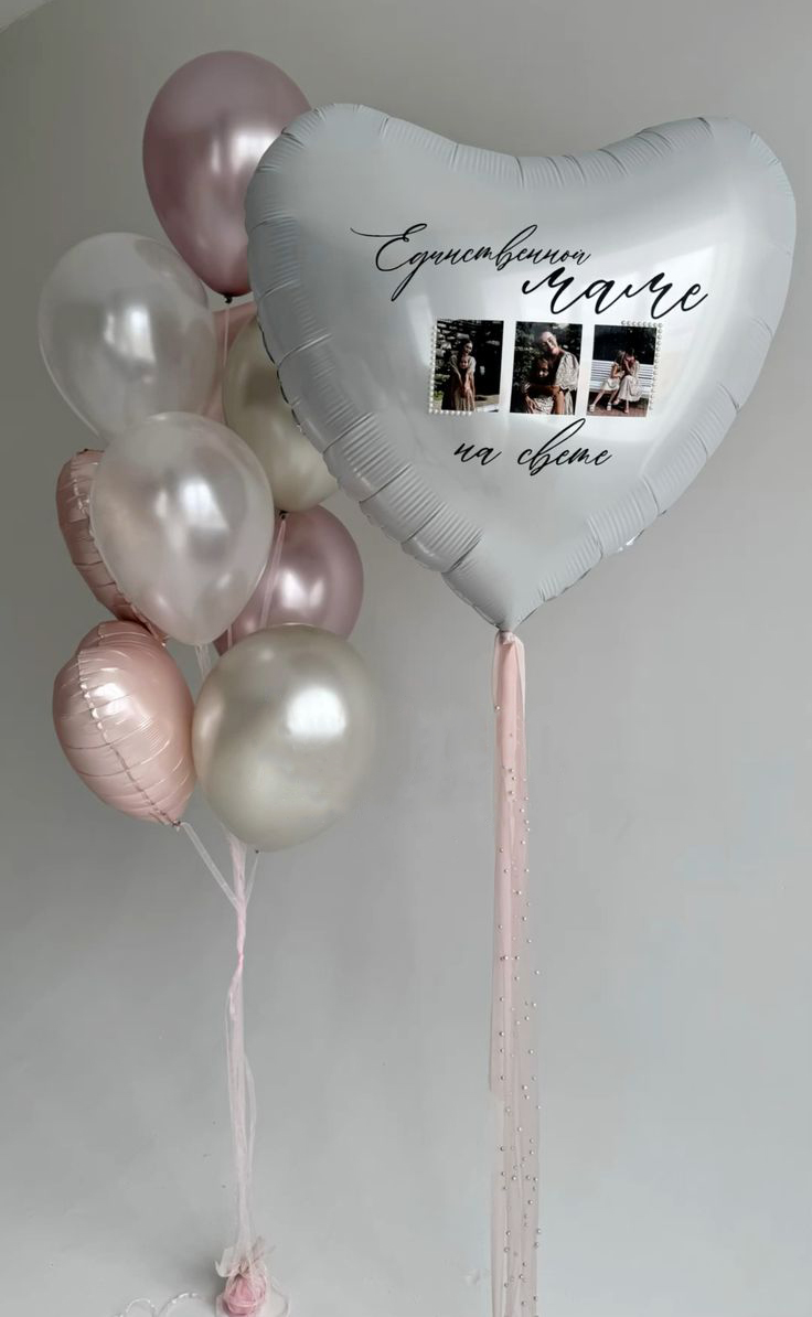 Белое сердце с фото и надписью и фонтан из шаров