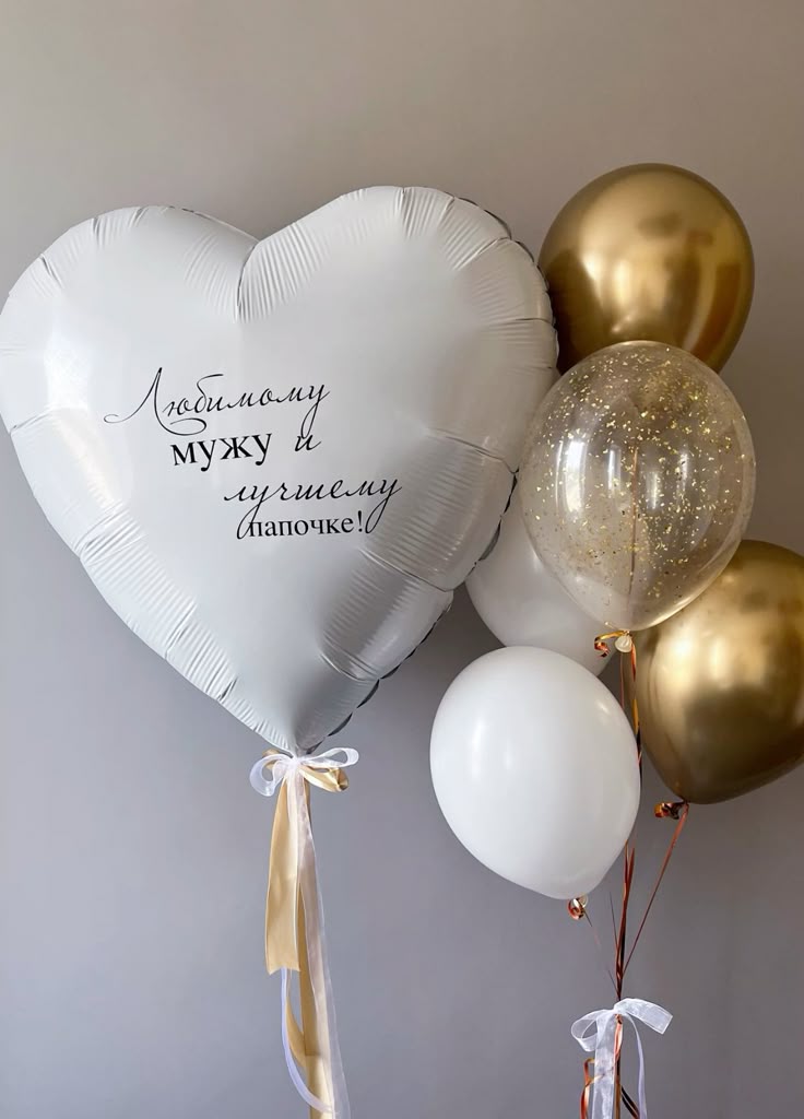—Белое сердце с надписью и фонтан из белых и золотых шаров