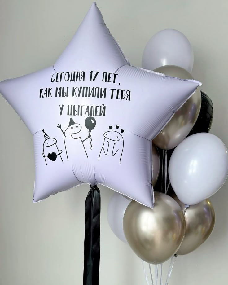 Большая звезда с надписью и рисунками и фонтан из шаров