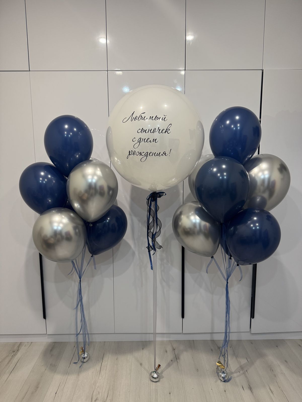 —Белый шар и фонтаны из синих и серебряных шаров
