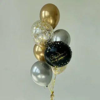 Фонтан с чёрным шаром с надписью, золотыми и серебряными шарами