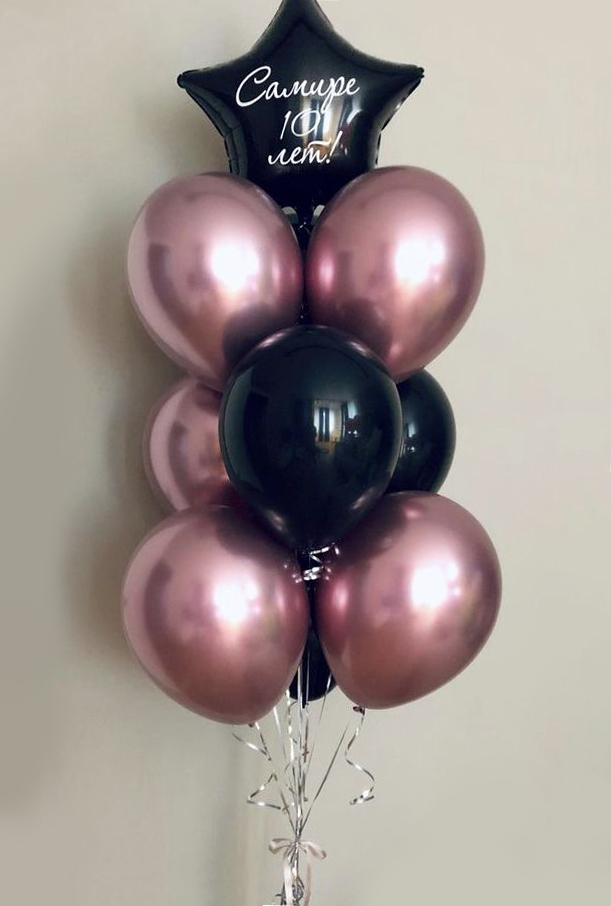 —Фонтан из шаров розовое золото, чёрных и чёрной звездой