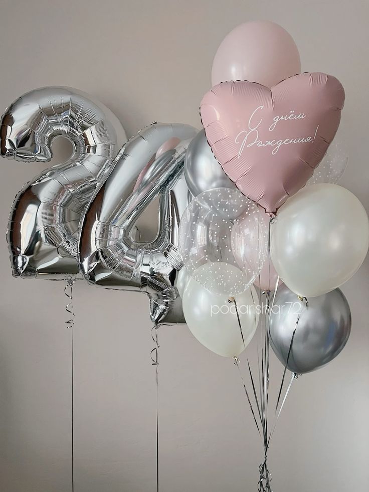 Серебряная цифра двадцать четыре и фонтан из шаров с сердцем
