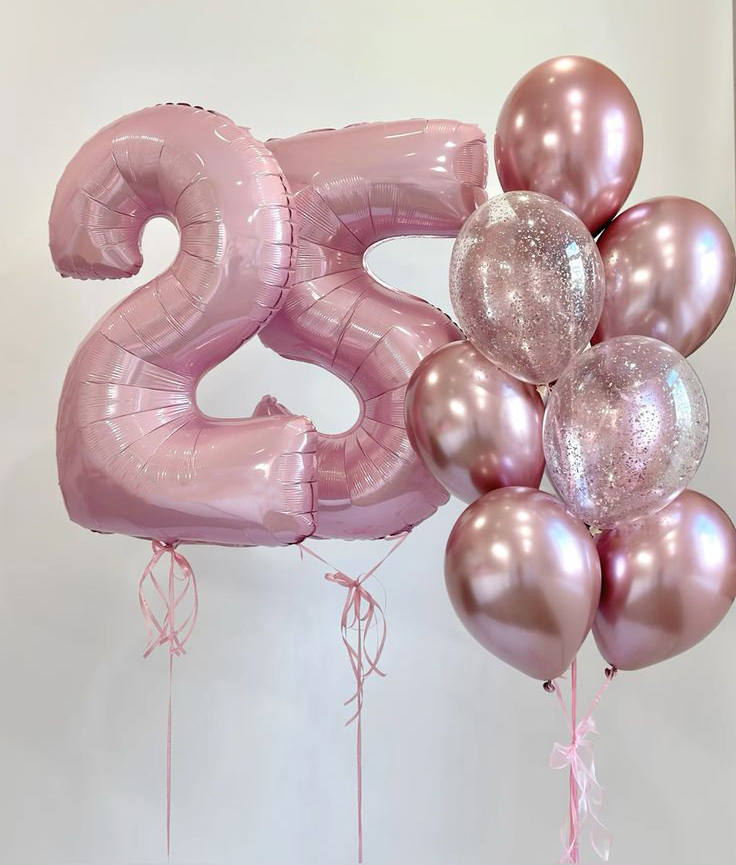 Нежно розовая цифра двадцать пять и фонтан из розовых шаров