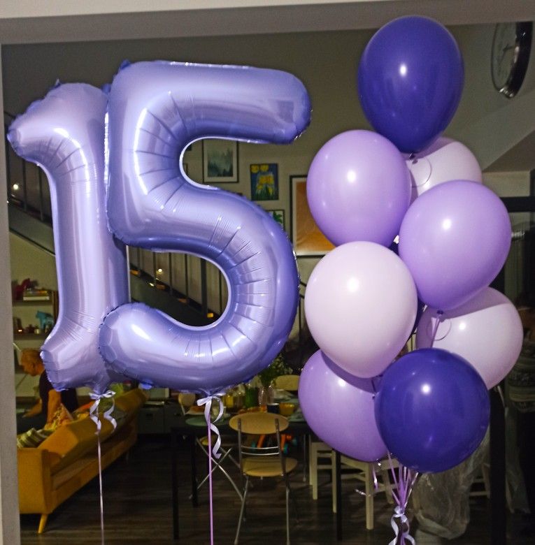 —Сиреневая цифра пятнадцать и фонтан из шаров