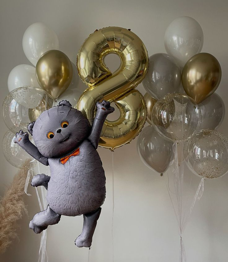 Золотая цифра восемь, котик и фонтаны из шаров