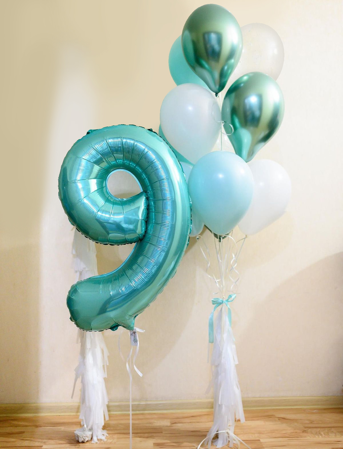 —Бирюзовая цифра девять и фонтан из шаров