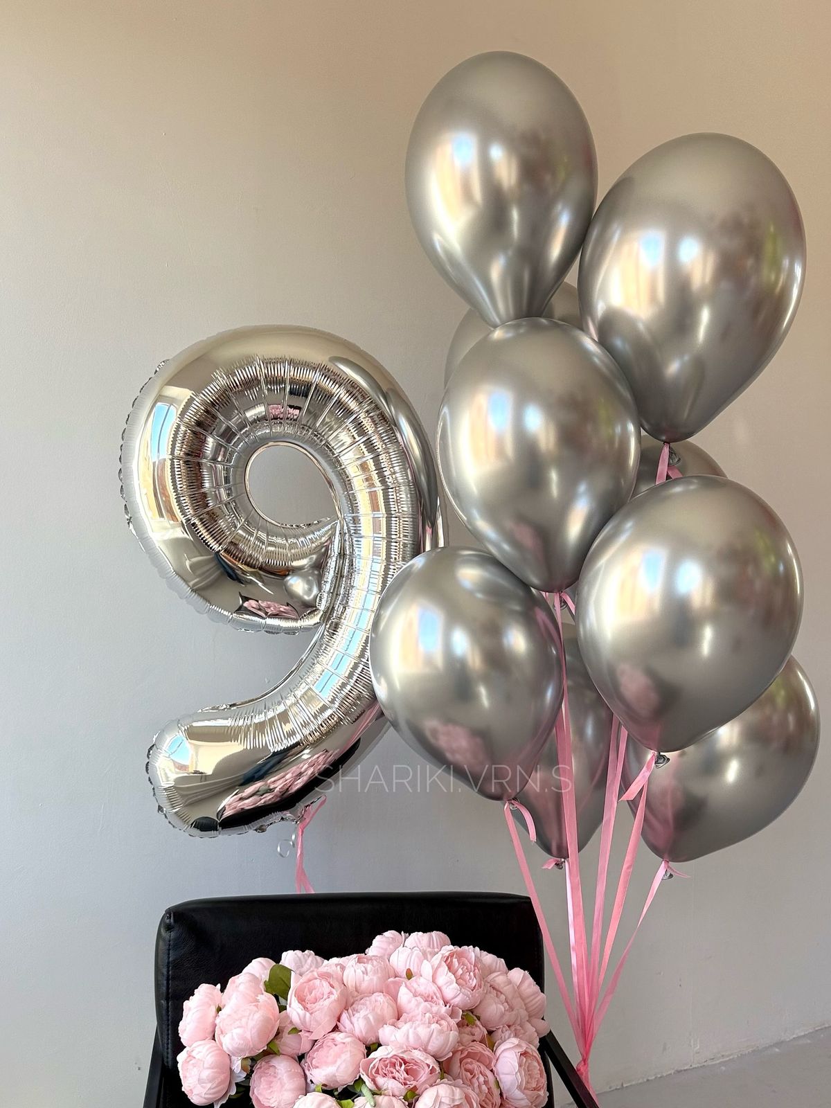 Серебряная цифра девять и фонтан из зеркальных шаров