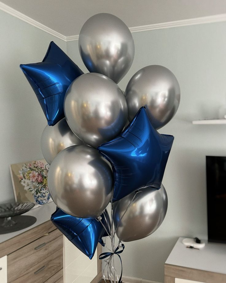 Фонтан из серебряных шаров хром и синих звёзд