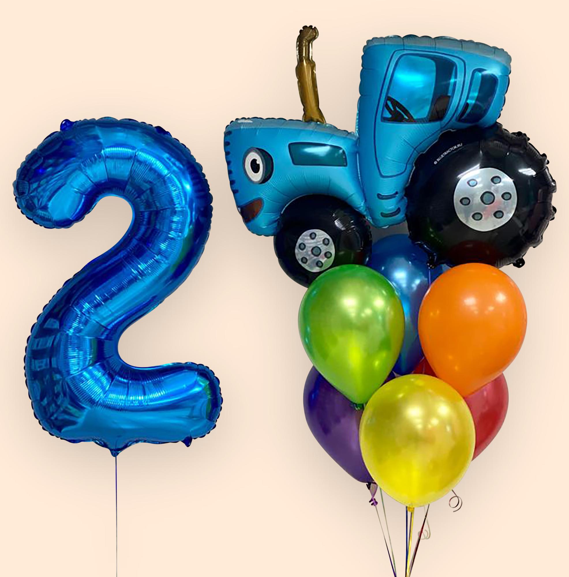 Синяя цифра два и фонтан из шаров с трактором