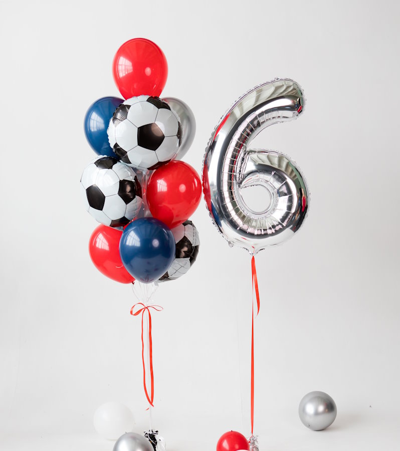 Серебряная цифра шесть и фонтан с футбольными мячами