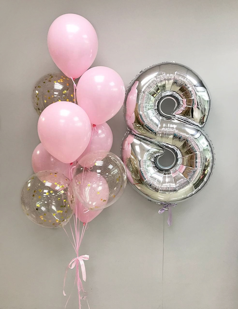—Серебряная цифра восемь и фонтан из розовых и серебряных шаров